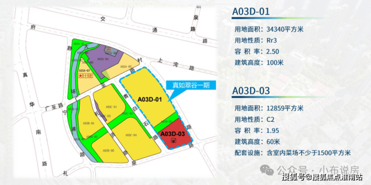 A03D-01地块:出让土地面积34340平方米,土地用途为普通商品房,规划容积率2.5,计容建筑面积85850平方米。