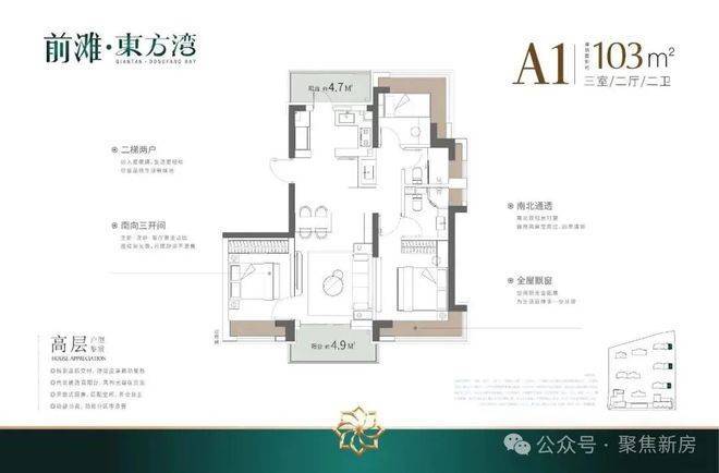 建面103㎡3房2厅2卫,户型三开间朝南、室内“5个飘窗+2阳台”,不管是采光、视野、通风、私密性,还是实用性都十分出色。