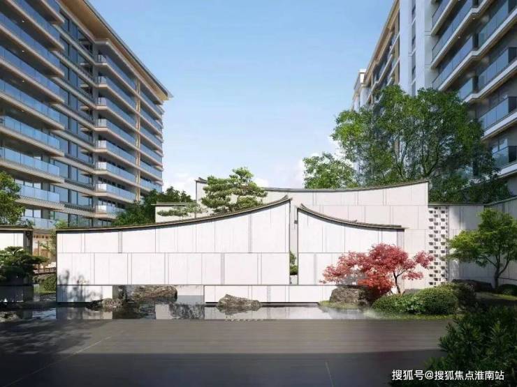 二进:穿过大门,古典雅致的 “飞鸟脊”景墙在静静等候,四周掩映的松树枫叶,伴着潺潺流水,舒缓了一天的疲倦。