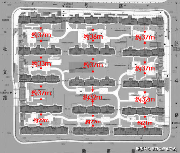楼栋高度大约在22m-35m之间,而除第一排洋房外的楼间距基本都在32-37m。