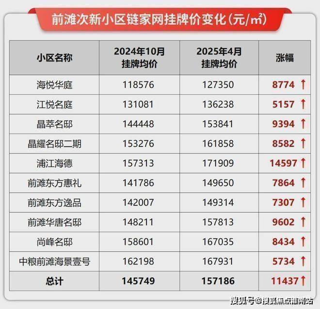 我统计了去年10月和今年4月前滩次新小区的挂牌均价,清一色的往上调价,晶萃名邸上涨9千+/㎡,浦江海德更是上涨近1.5万/㎡。平均上涨幅度超过1.1万/㎡!