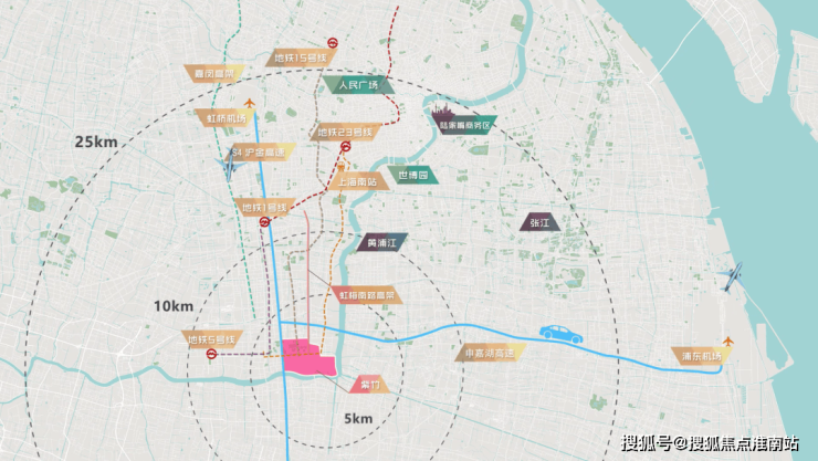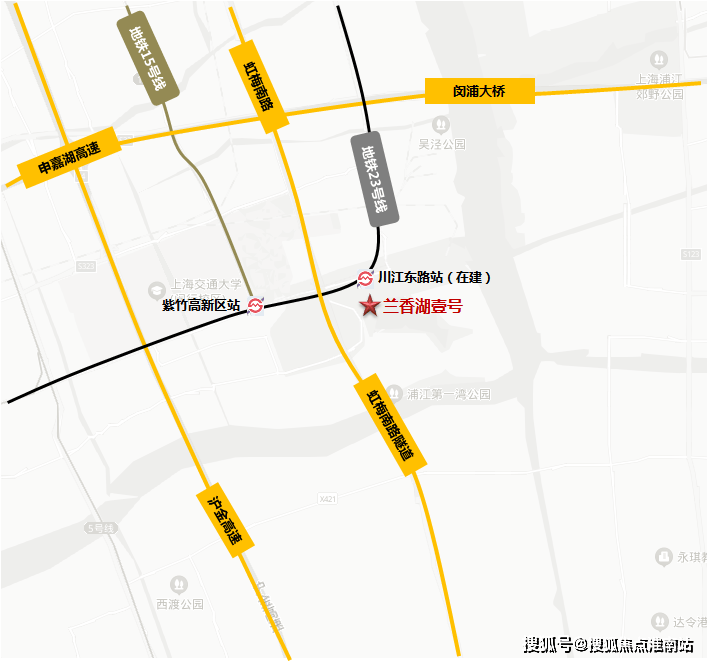 三轨交:5 号线(4.6km 东川路/江川路)、15 号线(1.6km 紫竹高新区站)、 23 号线(已开?,紫竹高新区站可与 15 号线无缝换乘)(以上数据来源于百度地图)