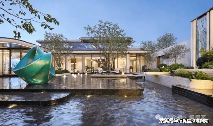 约7米高的主入口,把贝金米黄石材、维多利亚绿等名贵石材,与古铜色金属板、紫薇等名贵草木巧妙搭配、相得益彰,犹如穿着翠绿华服的翩翩公子,透着一身贵气。