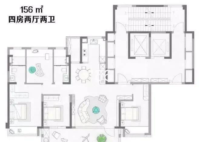 该户型为四房两厅两卫,对于改善家庭来说也完全够用。