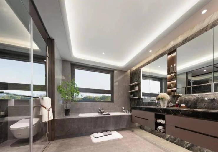 主卧豪华套房,面宽约5.4m,带衣帽厅和奢华卫浴体系。值得一提,还有一个南向次卧套房,卫生间也是朝南设计,避免暗卫。