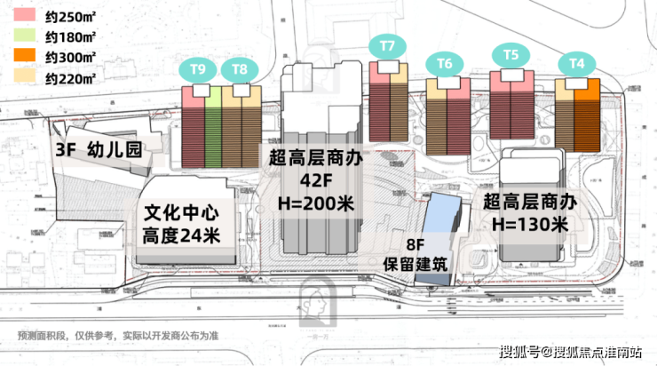 项目北侧五栋22-28层住宅,南侧自东向西依次是130米商办、保留8层现状建筑、200米商办和最高25米的文化中心及社区服务,地块最西侧是规划一所幼儿园。