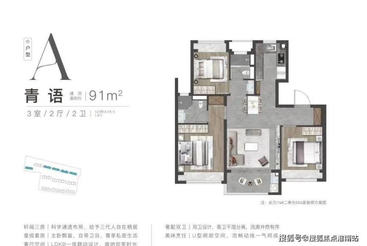 👉 91㎡三房两卫:三开间朝南,全屋3飘窗+开敞阳台,主卧套房设计,得房率78.5%,总价285万起;