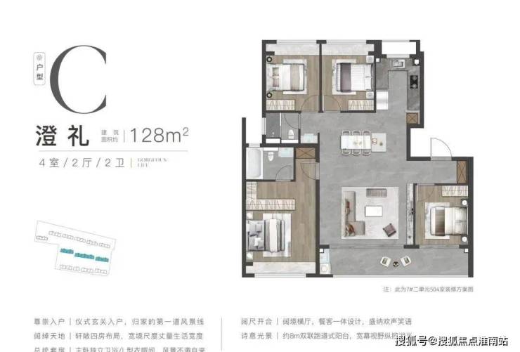 👉 128㎡四房宽厅:5米面宽客厅+双联阳台,得房率84.5%,媲美140㎡功能性。