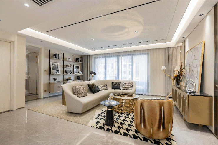 人性化细节也相当出彩。比如,客厅和主卧都标配悬浮吊顶、无主灯设计,背景墙采用皮革和铝合金拼接,也都是实体交付的。