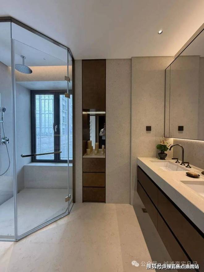 项目层高突破传统住宅达到约3.3米,空间感十足!搭配墙面、地面选用的米白色天然石材,以及顶部特殊的圆弧造型,通透造型空间尽显塔尖气质。