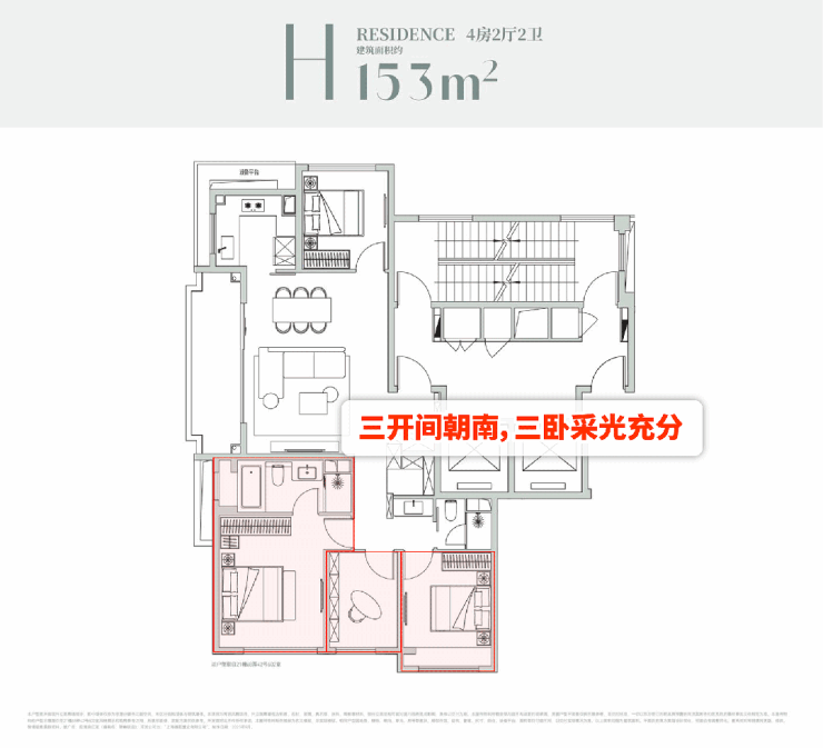 市面上多数4房户型常出现3-4个房间扎堆的问题,次卫的洗漱声、交谈声轻易传遍相邻房间,私密性与居住静谧感打折扣.