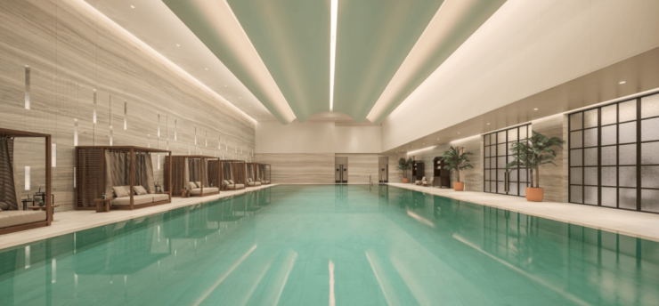上海澐启滨江的会所功能环绕中心水院布局,集中设置泳池、健身、瑜伽、私宴与茶室等,大型透明玻璃舱体构建的全景悬浮泳池,让业主在健身游泳的同时也能享受极致景观体验。