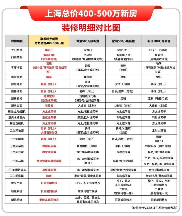 我把各区目前四百万比较热门的新房的装修标准做了横向对比: