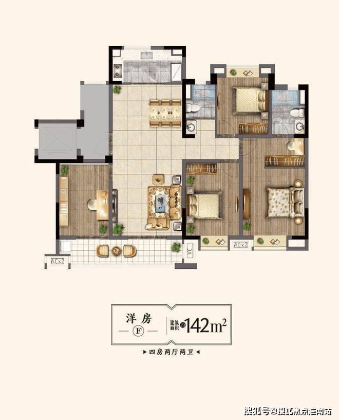 132㎡四房两厅两卫。该户型达到了四开间朝南,一个套卧,并且是南北双阳台,保证了采光,南北通透,132㎡能够同时做到四房及南北通透的,市面上并不常见。在功能性和舒适性上都能满足客户的需求。