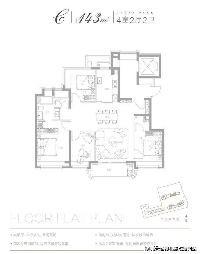 建面约 143㎡四房:四开间朝南,老人房与儿童房分置两端,主卧套房配备步入式衣帽间与观景飘窗,有可变空间。