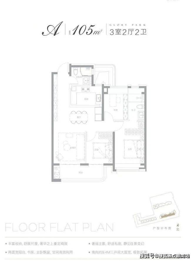 建面约 105㎡三房两厅两卫:采用经典南北通透格局,客厅开间约 4.2 米,搭配同等尺度景观阳台,三个卧室均带飘窗,主卧为独立套间,得房率高达 74.4%-79.3%。