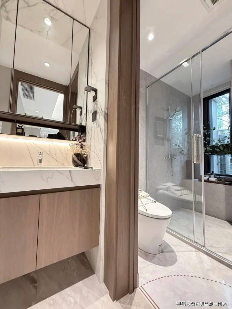 卫浴方面,采用科勒的水龙头、台下盆、花洒、星逸智能一体化马桶,艾美特的风暖浴霸等,更配置恒温花洒+滑竿+顶喷等。