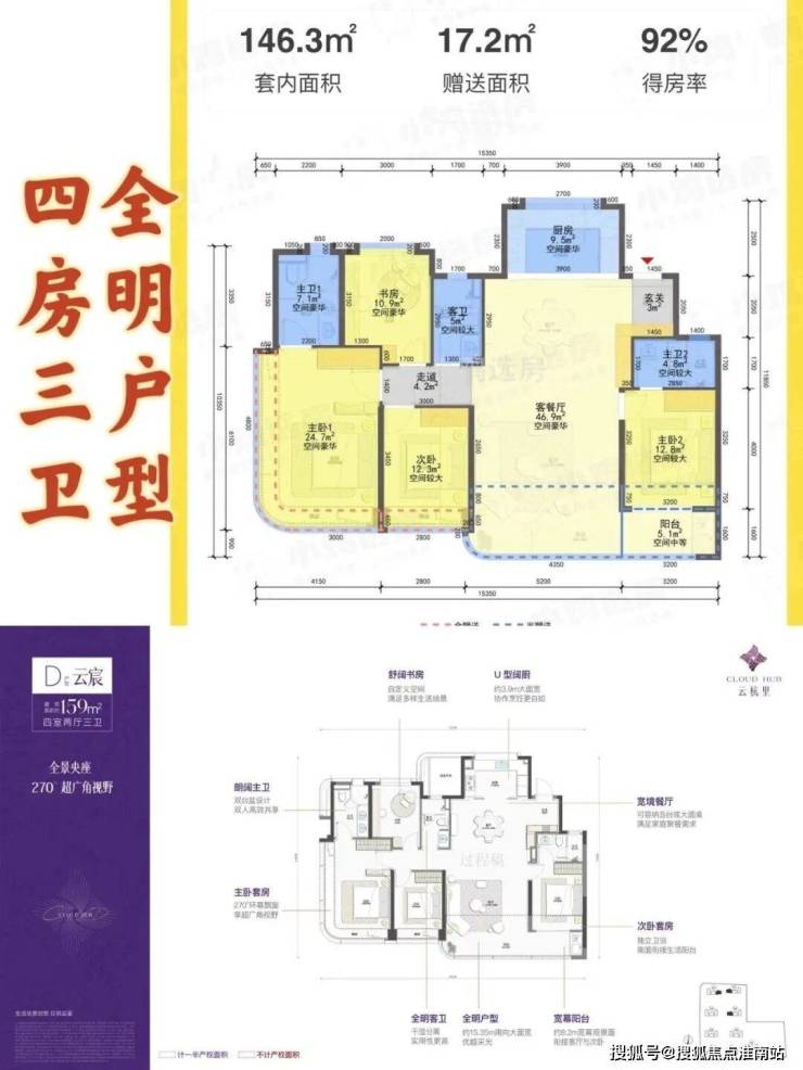 建面约159㎡:四房两厅三卫,边套设计,双主卧套房配置,私密性与舒适度兼具。