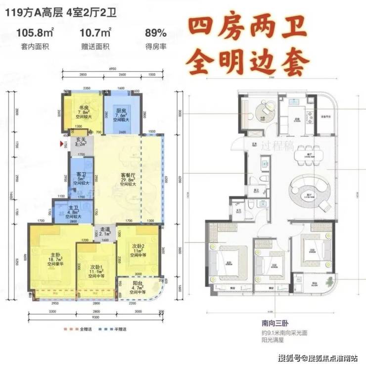 建面约119㎡:三房两厅两卫,南北通透,全明格局,适合年轻家庭一步到位。