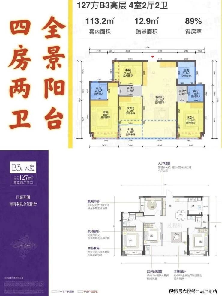 建面约139㎡:四房两厅两卫,大横厅设计,空间利用率高,满足多口之家需求。