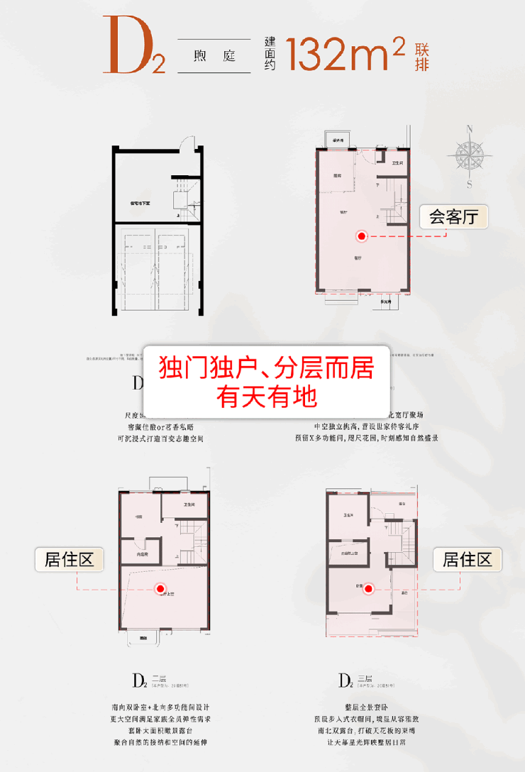 项目主推建面约132㎡联排别墅,拥有前庭后院+超大挑空+南北双星空露台+室内庭院等超享空间,是一院一厅间的无界私院。