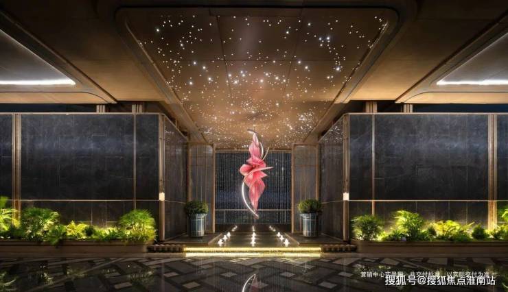下沉式环幕庭院,跌水景观环绕,池底仿黑金砂与宝石晶片闪烁,点缀百余灯珠,师法“琉璃水光” 形意,糅合视听五感,打造全浸式立体园境,天工巧夺,嘉定未见。