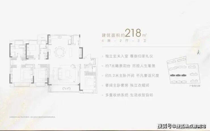 建面约218㎡户型:4室2厅3卫的顶配设计,拥有独立家政间和双套房设计,客厅与餐厅形成LDK一体化空间,连接约8米宽景观阳台,主卧配备独立衣帽间和豪华主卫