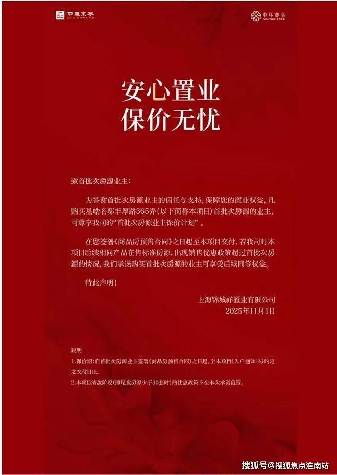 上海第二个作出“保价”承诺的项目,11月1日,中环麓岛项目也发布了公告:凡购买首批次房源的业主,可享“首批次房源业主保价计划”: