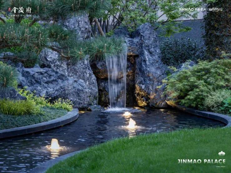 草坪、水景、黑山石之间,移步换景,人在里面走,会很自然放慢节奏。
