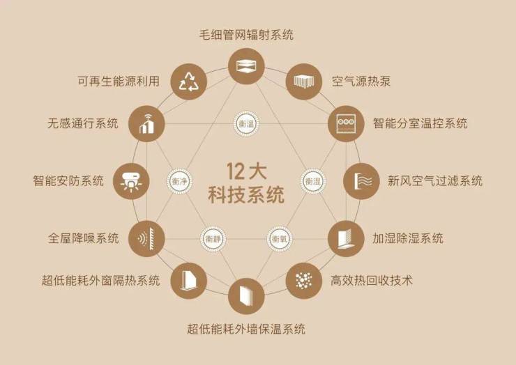 科技系统:升级分户式五恒系统(恒温/恒湿/恒氧/恒净/恒静),12大科技系统,同层排水、全屋隔音