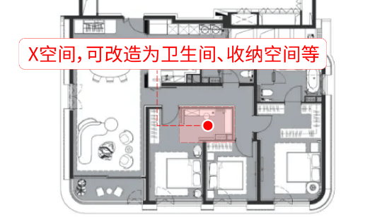 次卧同样是一个套房,并且设计了一个X空间,这个空间可以是一个卫生间,又或者是一个储藏室、衣帽间,甚至是办公学习区域均可。