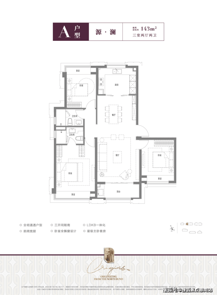 这是项目建面 约143平户型图,这个面积其实不管做常规四房或者三房空间都充足。