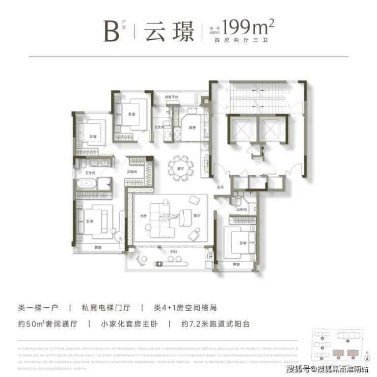 建筑面积约199㎡的A户型,采用类一梯一户的尊崇设计,实现“电梯厅玄关化”,保障极致私密性。户型南向面宽达约16米,拥有舒适开阔的南向客厅。南北双阳台设计,南向约8.5米景观阳台尽览美景,北向生活阳台轻松容纳洗烘设备。此外,独特的抬板设计使二楼离地约9.2米,相当于传统四楼的高度,带来更优的采光与视野体验。
