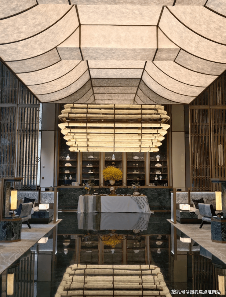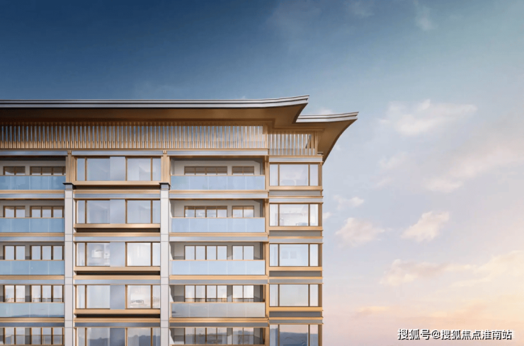 大平层建筑立面以大面积铝板、首层局部石材及大面积玻璃构成,屋顶建发中式标志性的飞檐设计,美观的同时还比较显格调。