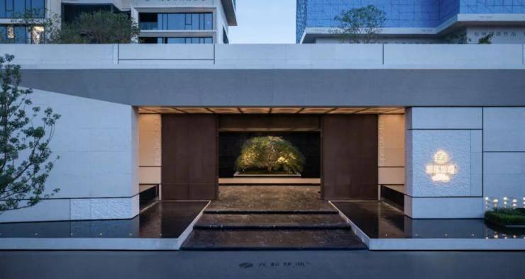 在近人尺度使用沉香米黄石材,以石材的厚重与质感彰显归家的仪式;2层以上采取仿石铝板,以几十种花纹进行拼接,模拟石材分缝,形成方正有序的凹凸进退关系,强化立面的光影效果,既有石材的质感,又实现了更强的外立面造型。