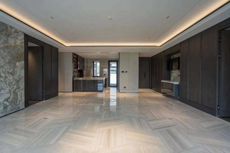 比如墙面采用大量的安第斯雪景奢石和深木饰面,客厅地面铺设欧亚白奢石菱形错拼,客餐厅贴脚线是金属不锈钢材质,将高级感渗透到生活的每个角落。