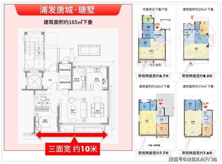对比来看,项目面宽不仅远超主流两开间叠墅,甚至比市面上部分产品力较强的170-180㎡叠墅还要宽。