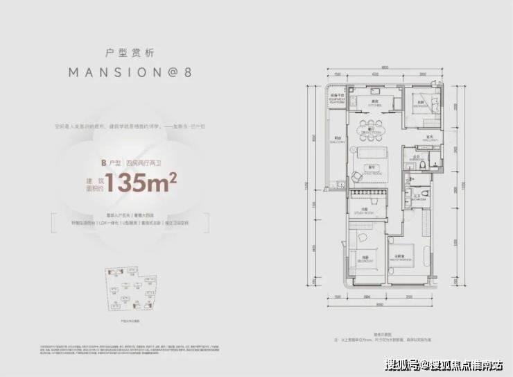 建面约135方边套户型,在空间设计上,升级户型灵动性和社交空间最大化,精心布局入户玄关,近40方的光幕大横厅、主卧星级套房、全景飘窗、约4.3米面宽的厨房等空间系统,完全是以豪宅的尺度奢享不同阶段的生活。