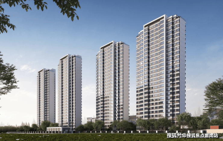 外立面上,采用玻璃幕墙+顶部金色格栅塔冠设计,四栋住宅一字排开,户户朝阳享受开阔视野与充足采光的居住体验。