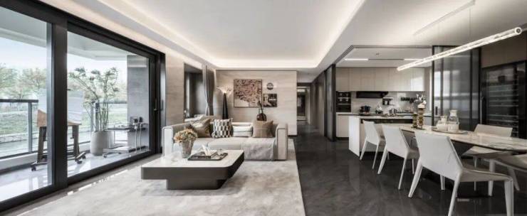 餐客厅弧形吊顶,柔和空间的边界,更带来视觉的延伸,增强空间的通透感,让空间更显明朗。与主卧配置的智慧灯光系统联动,让光线营造不同场景下的居家氛围感。