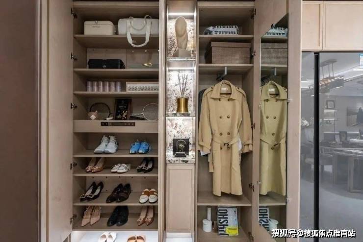 137㎡户型在此基础之上叠加“雪山银狐”奢石壁龛,小件随手即归位,行李箱、滑雪板、登山杖等大件也有独立空间,抽拉、拿取都在一步之内。冰箱柜被巧妙“藏起”,维持立面干净统一。