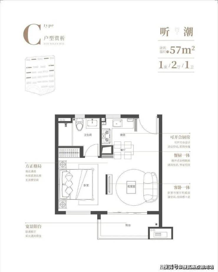 【高层80平】6.8m大面宽双阳台,180º东西向全景观海,户型方正,南北通透!