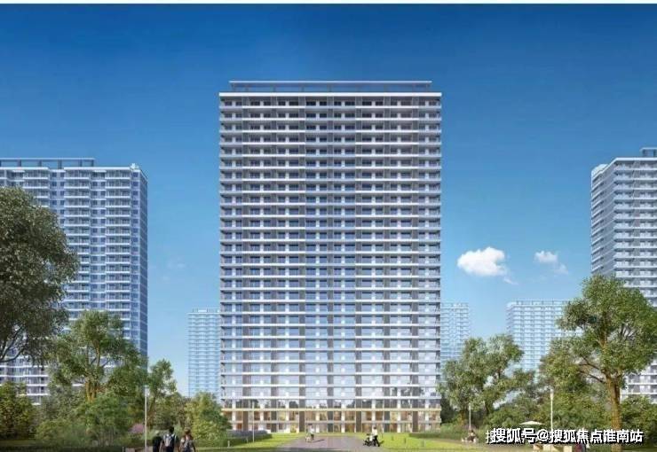 住宅建筑风格为现代简约,建筑立面以米白和浅灰为主,辅以粉色和蓝色为点缀;小区拥有4个出入口,南北为人行出入口,东西为车行出入口。