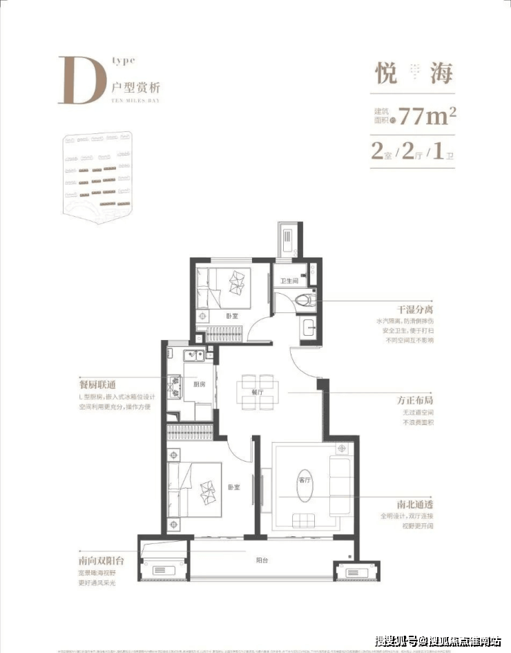 【洋房77平】约6m大面宽双阳台,干湿分离,方正布局,南北通透!