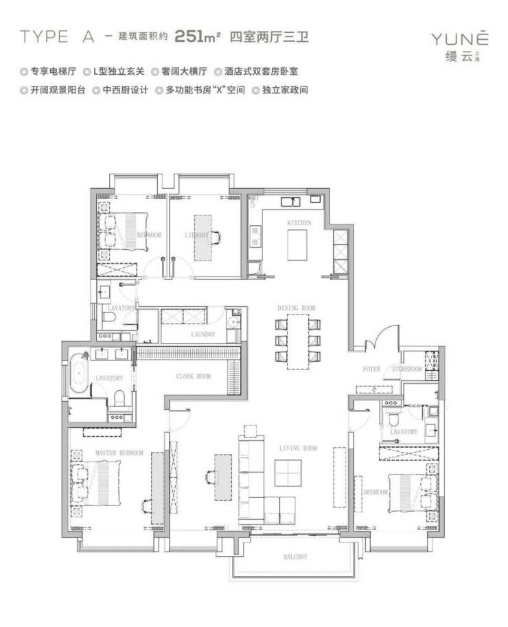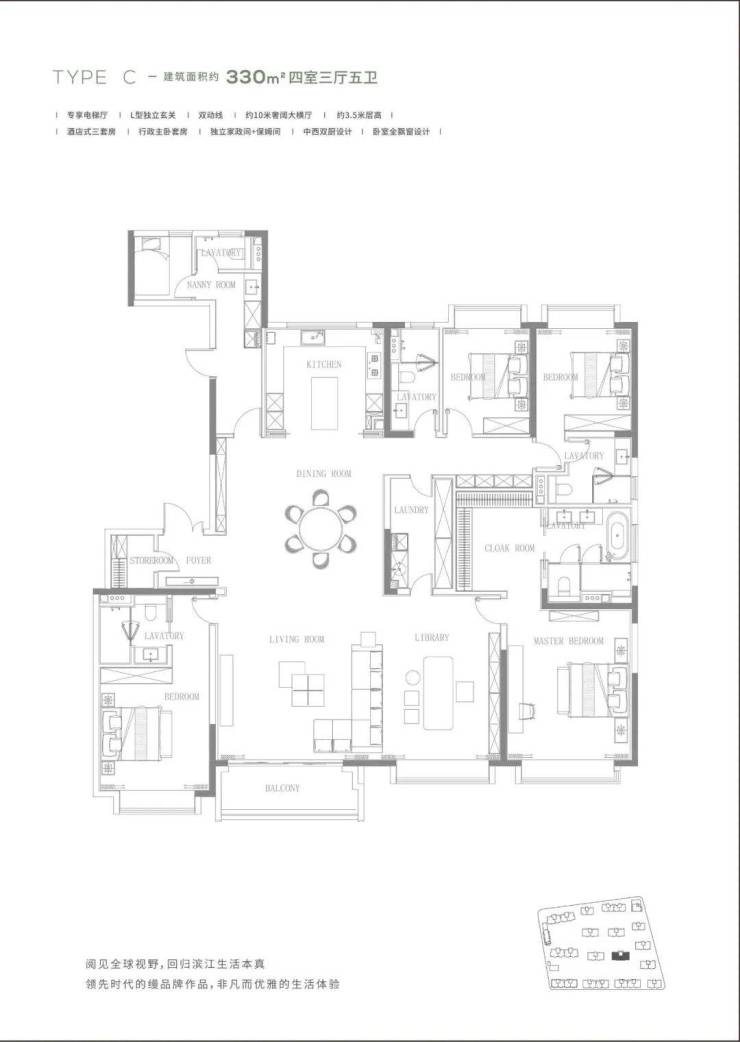 主力户型:建面约153–330㎡的三至五房大平层,产品纯粹,无小户型混杂