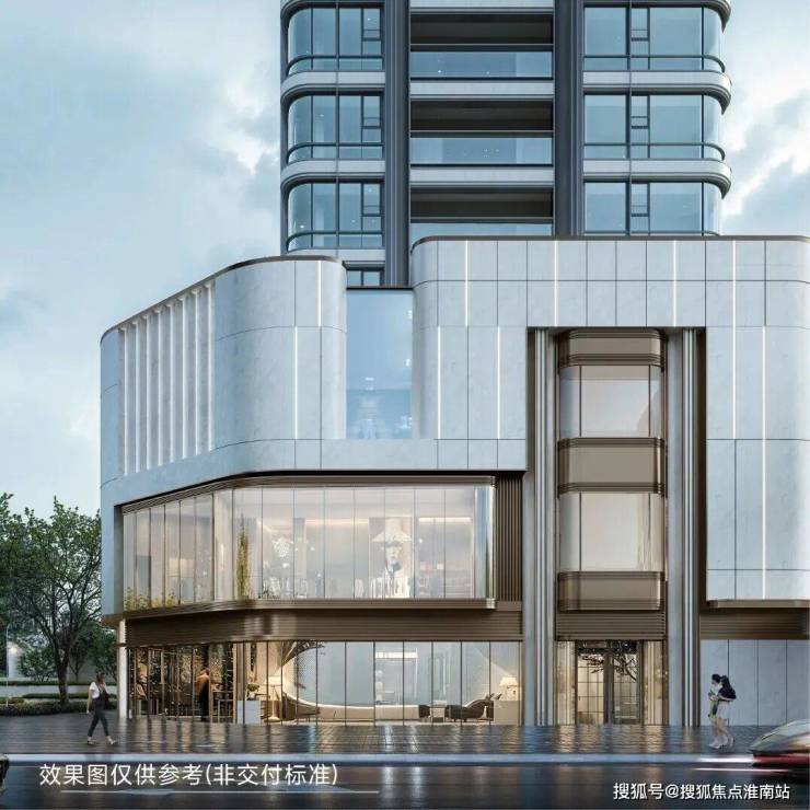 站在远处仰望,整栋建筑宛如一件定制礼服,优雅而高贵。鎏金塔冠、弯弧铝板、弧形钻幕带来视觉动感。