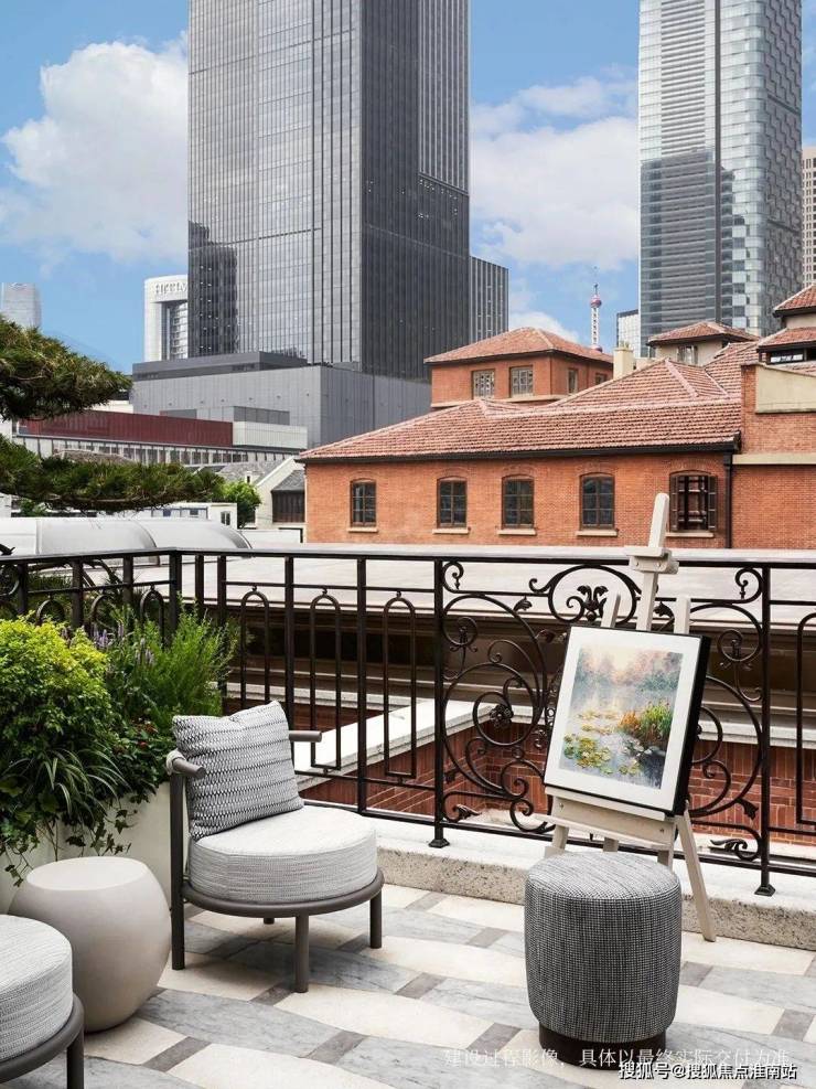 凭栏远眺, 近处是百年石库门的红瓦飞檐,远处是上海城市名片东方明珠,皆是业主独享的城市画卷。