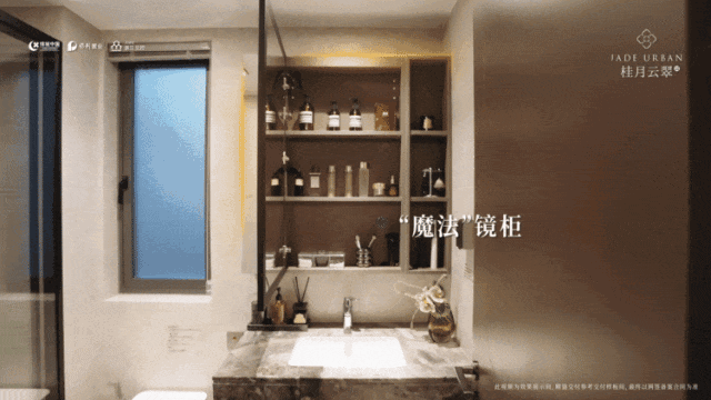 ◈主卫“魔法”镜柜:双面镜柜,主镜防雾膜+灯带,美妆更清晰;双孔插座,便于电动牙刷、剃须刀等使用。