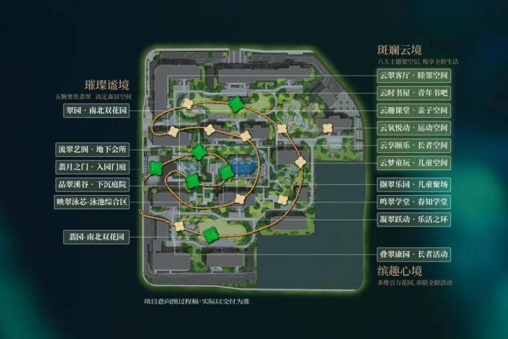 创新灵感源于19世纪美国“波士顿翡翠项链”的设计理念,通过形似“项链”的公园绿道。桂月云翠园以“翡翠项链”为母本,通过立体串联的景观手法,将归家的建筑景点逐一串联,配备下沉庭院+地下会所、泳池综合区、南北两大超5000㎡主题花园,营造高浓度生活体验。