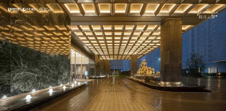 高定归家:约50m的“翡月之门”,是绿城保利交控·桂月云翠带给人的最初印象。流金穹顶与皇家金檀大理石构画的背景前,一方环岛车行落客区,令五星级酒店式归家成为现实。“明月松间照,清泉石上流。”王维独到的山水观,在下沉式庭院“空翠砯崖”上演。